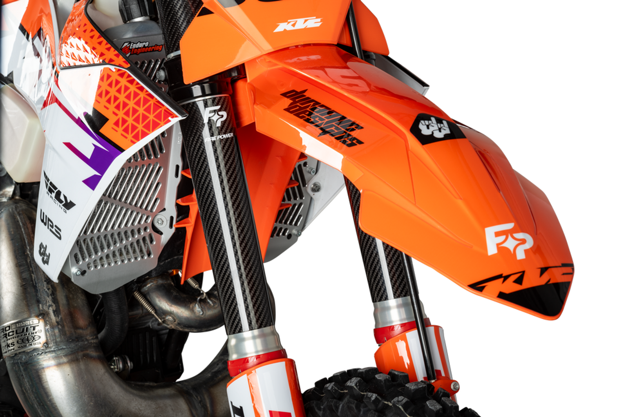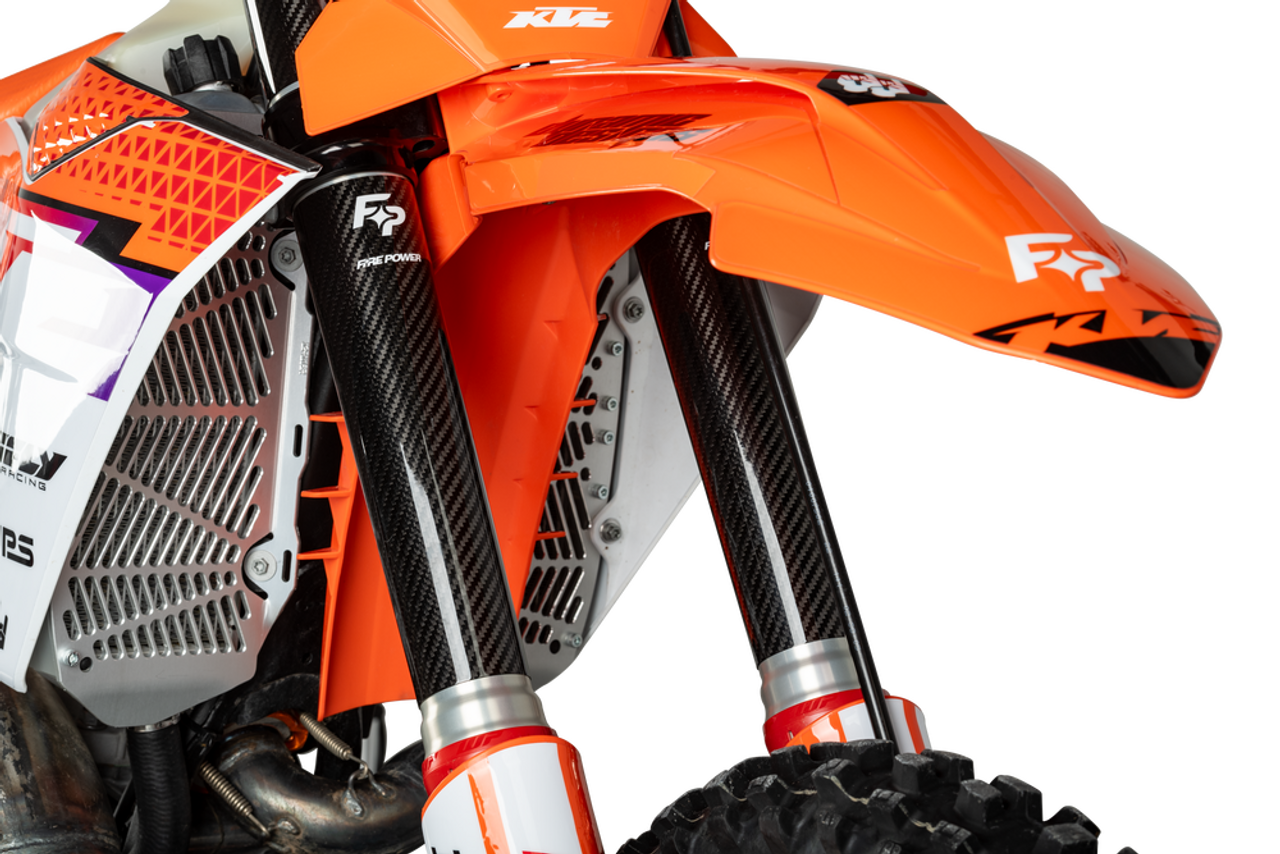 Fire Power's new Carbon Fiber Fork Shields protect the motorcycles fork tubes from rock, roost, and other damage. These lightweight, easy to install carbon fiber fork shields will upgrade your motorcycle's appearance and, most importantly, protect your fork tubes. Fire Power's new Carbon Fiber Fork Shields protect the motorcycles fork tubes from rock, roost, and other damage. These lightweight, easy to install carbon fiber fork shields will upgrade your motorcycle's appearance and, most importantly, protect your fork tubes.